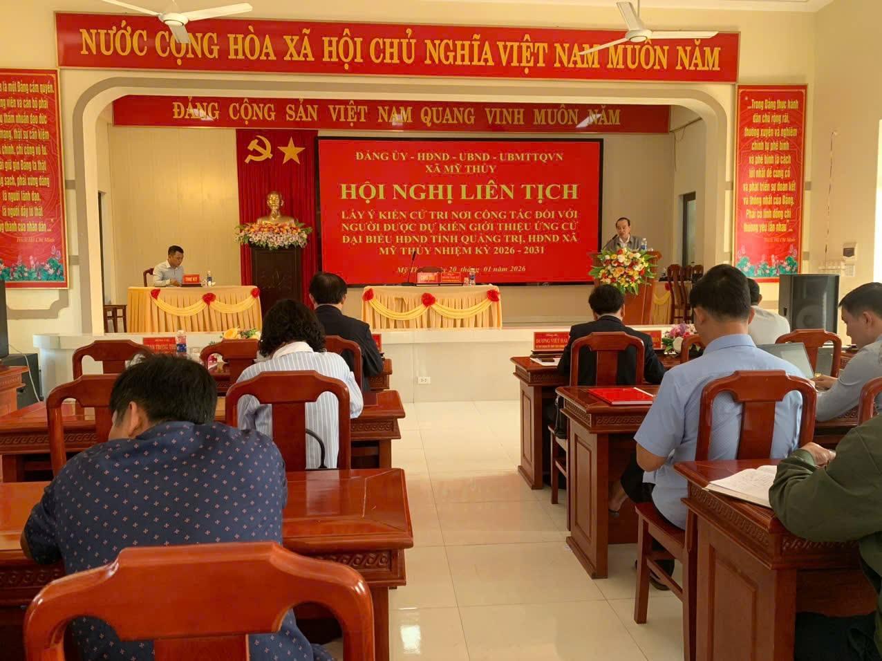 Ngày 20/01 Đảng ủy xã Mỹ Thủy tổ chức Hội nghị Liên Tịch giữa Đảng ủy-HĐND-UBND-UBMMTTQVN, các tổ chức chính trị xã hội để lấy ý kiến cử tri nơi công tác với người được giới thiệu ứng cử đại biểu HĐND tỉnh và HĐND xã nhiệm kỳ 2026-2031.