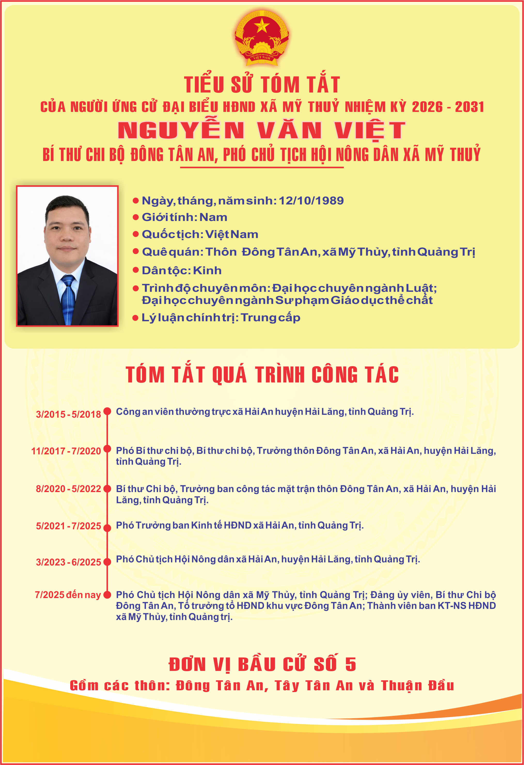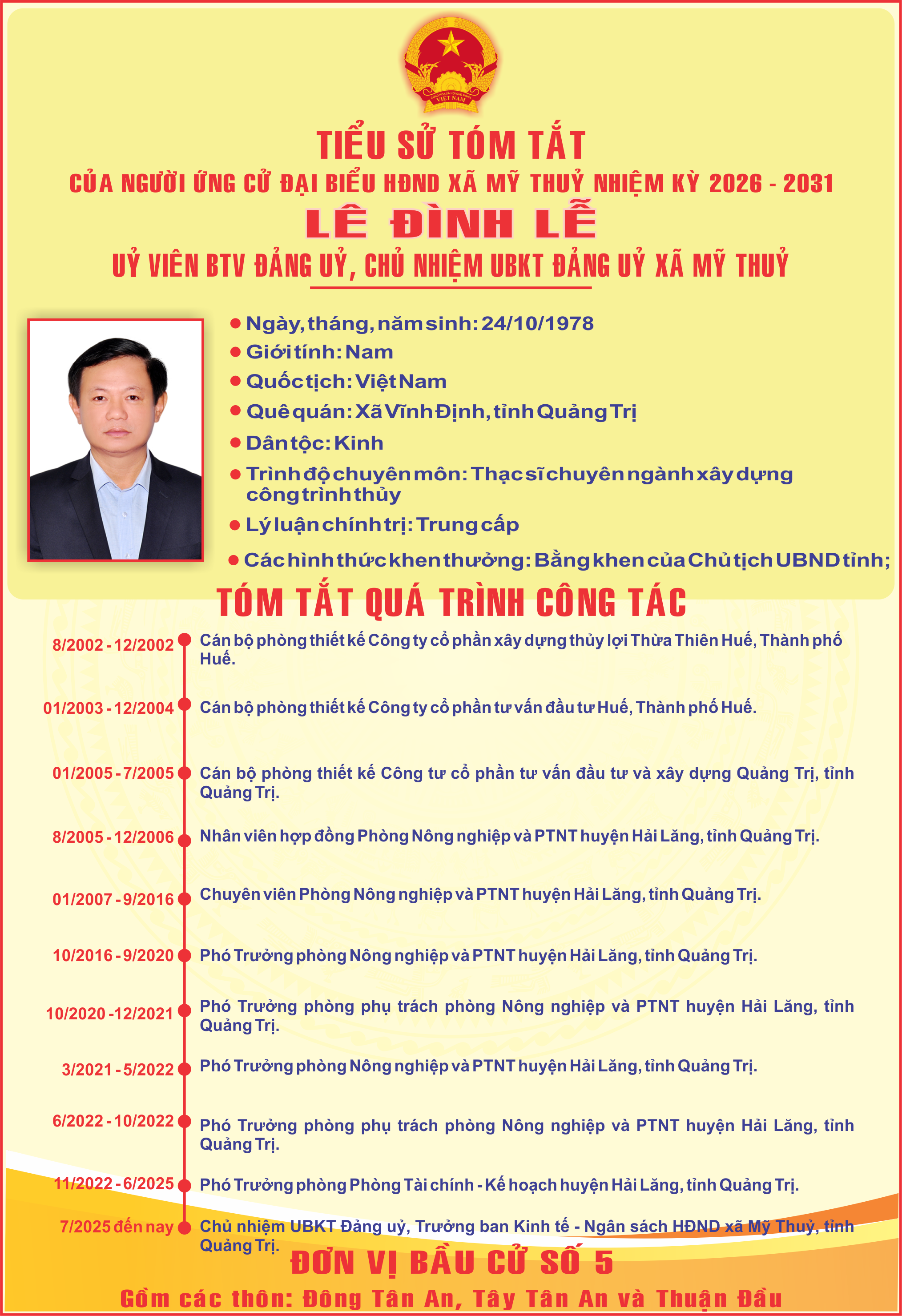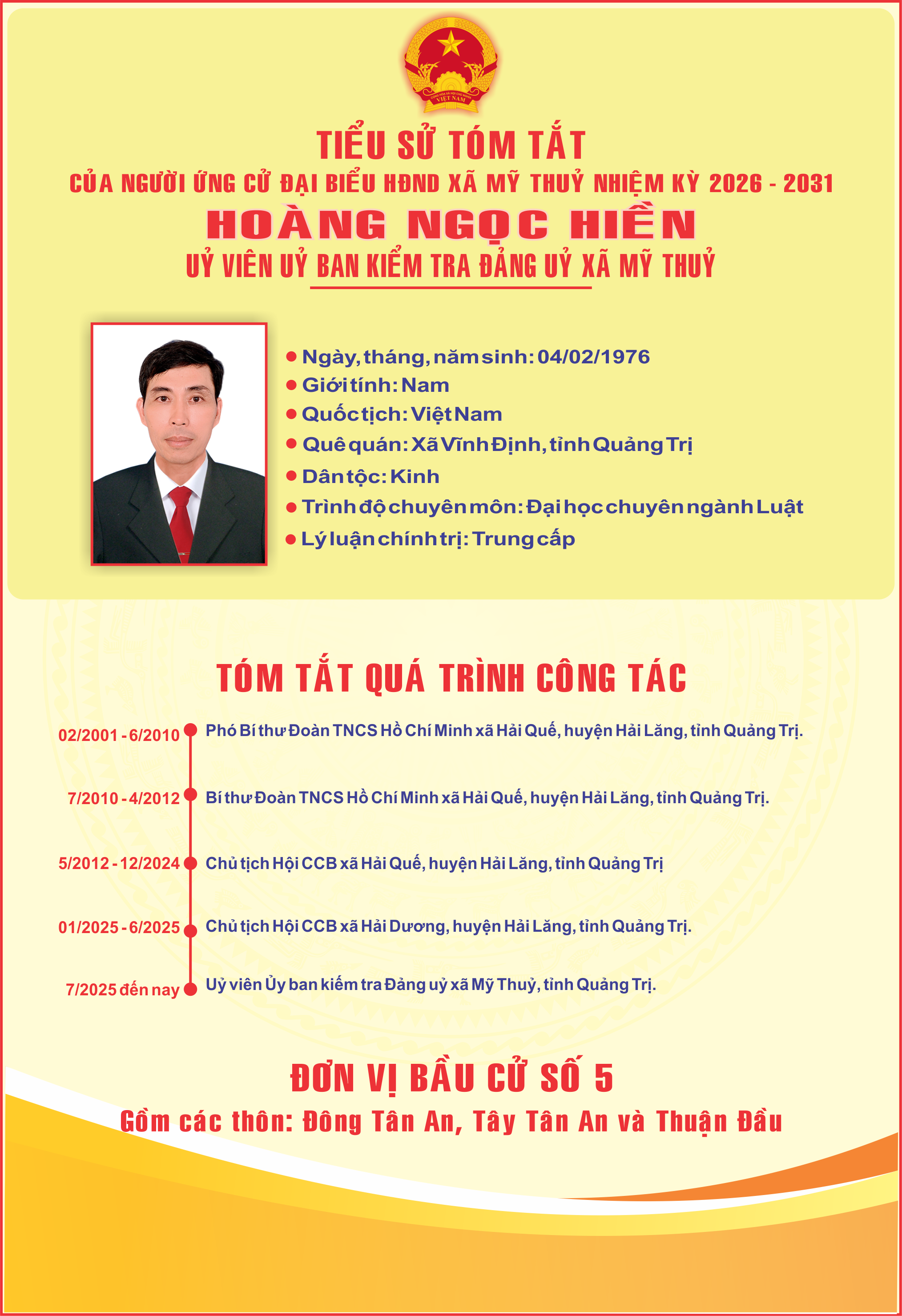 - TIỂU SỬ TÓM TẮT CỦA ĐỒNG CHÍ DƯƠNG VIẾT HẢI - BÍ THƯ ĐẢNG UỶ, CHỦ TỊCH HĐND XÃ MỸ THUỶ - ỨNG CỬ VIÊN ĐẠI BIẾU HĐND TỈNH QUẢNG TRỊ NHIỆM KỲ 2026 - 2031 (05/03/2026)