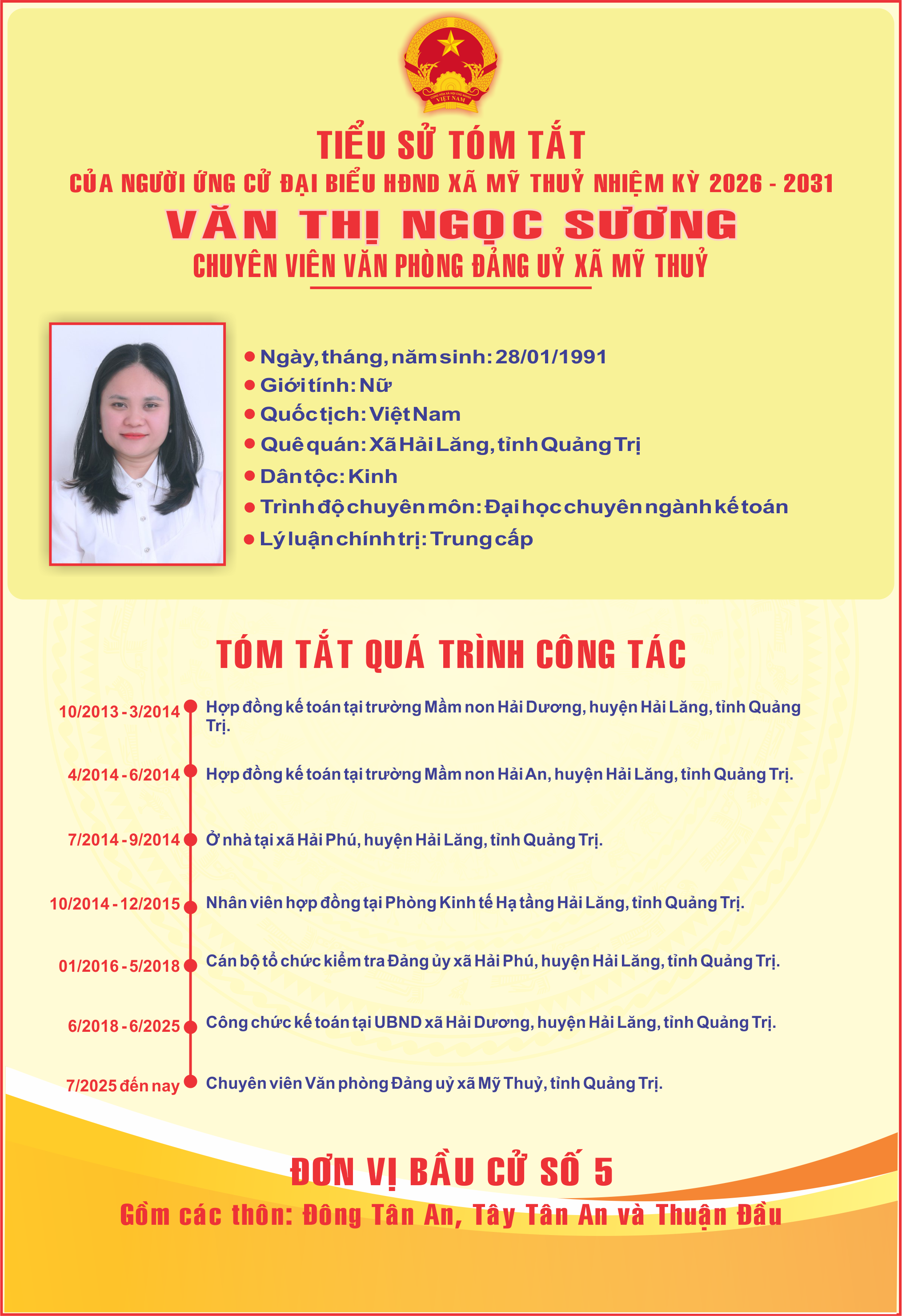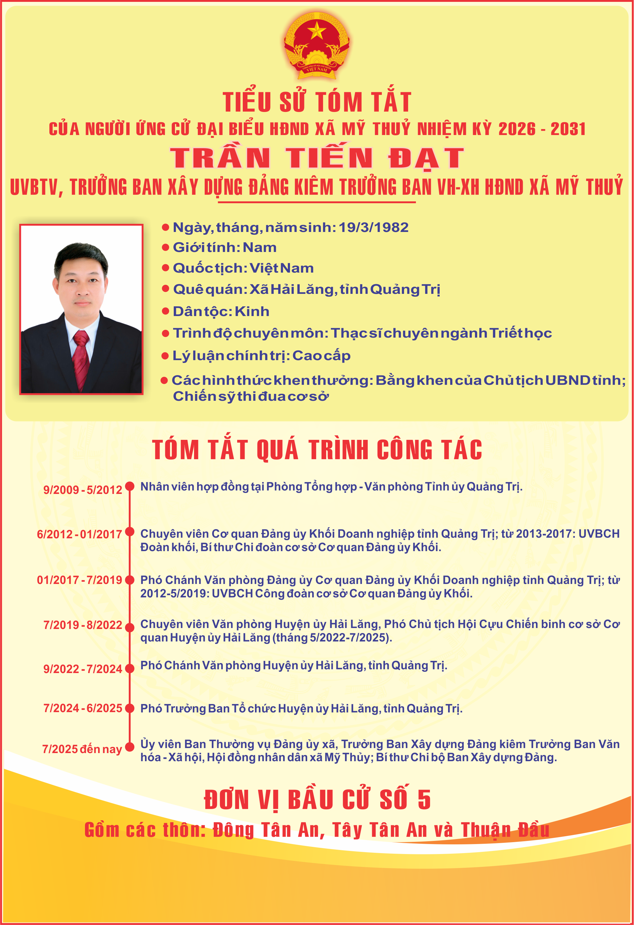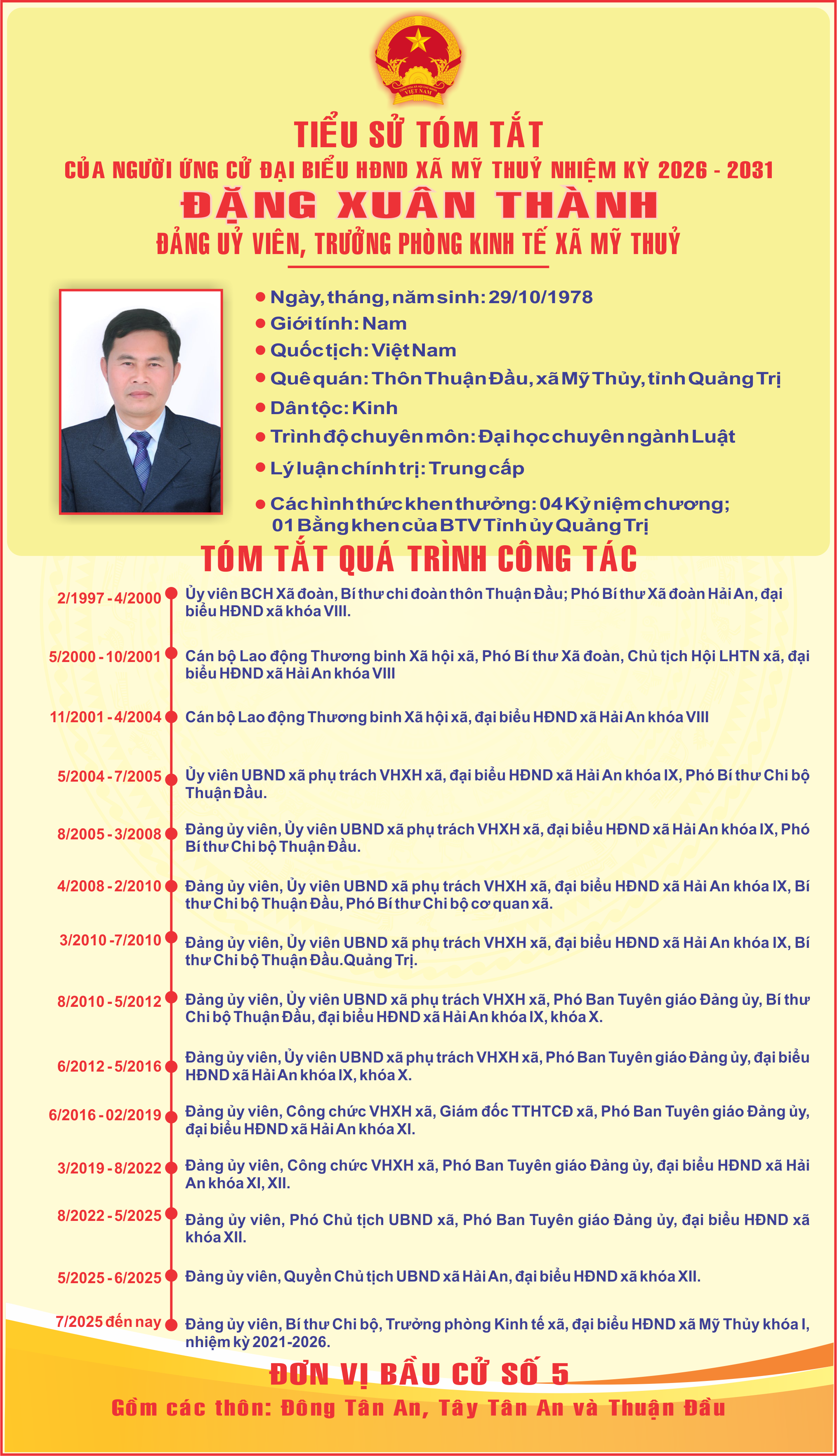 - TIỂU SỬ TÓM TẮT CỦA ĐỒNG CHÍ DƯƠNG VIẾT HẢI - BÍ THƯ ĐẢNG UỶ, CHỦ TỊCH HĐND XÃ MỸ THUỶ - ỨNG CỬ VIÊN ĐẠI BIẾU HĐND TỈNH QUẢNG TRỊ NHIỆM KỲ 2026 - 2031 (05/03/2026)