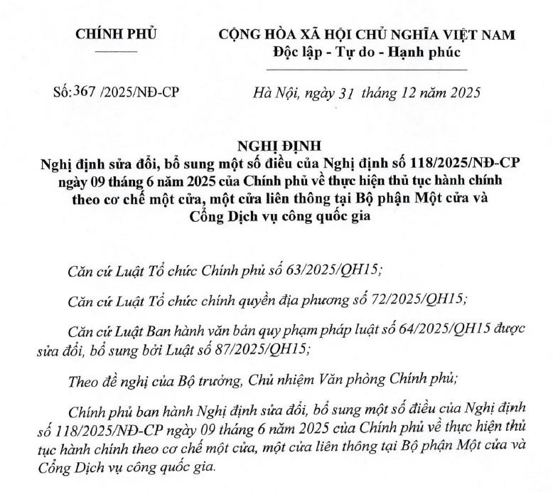Nghị định số 367/2025/NĐ-CP ngày 31/12/2025 Nghị định sửa đổi, bổ sung một số điều của Nghị định số 118/2025/NĐ-CP ngày 09 tháng 6 năm 2025 của Chính phủ về thực hiện thủ tục hành chính theo cơ chế một cửa, một cửa liên thông tại Bộ phận Một cửa và Cổng Dịch vụ công quốc gia
