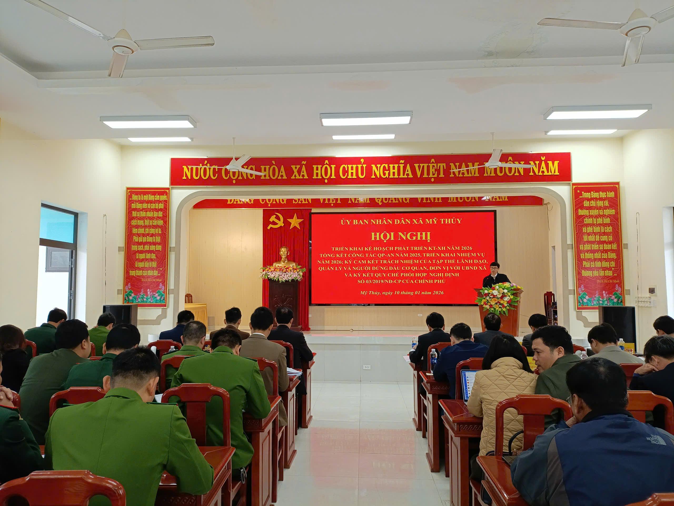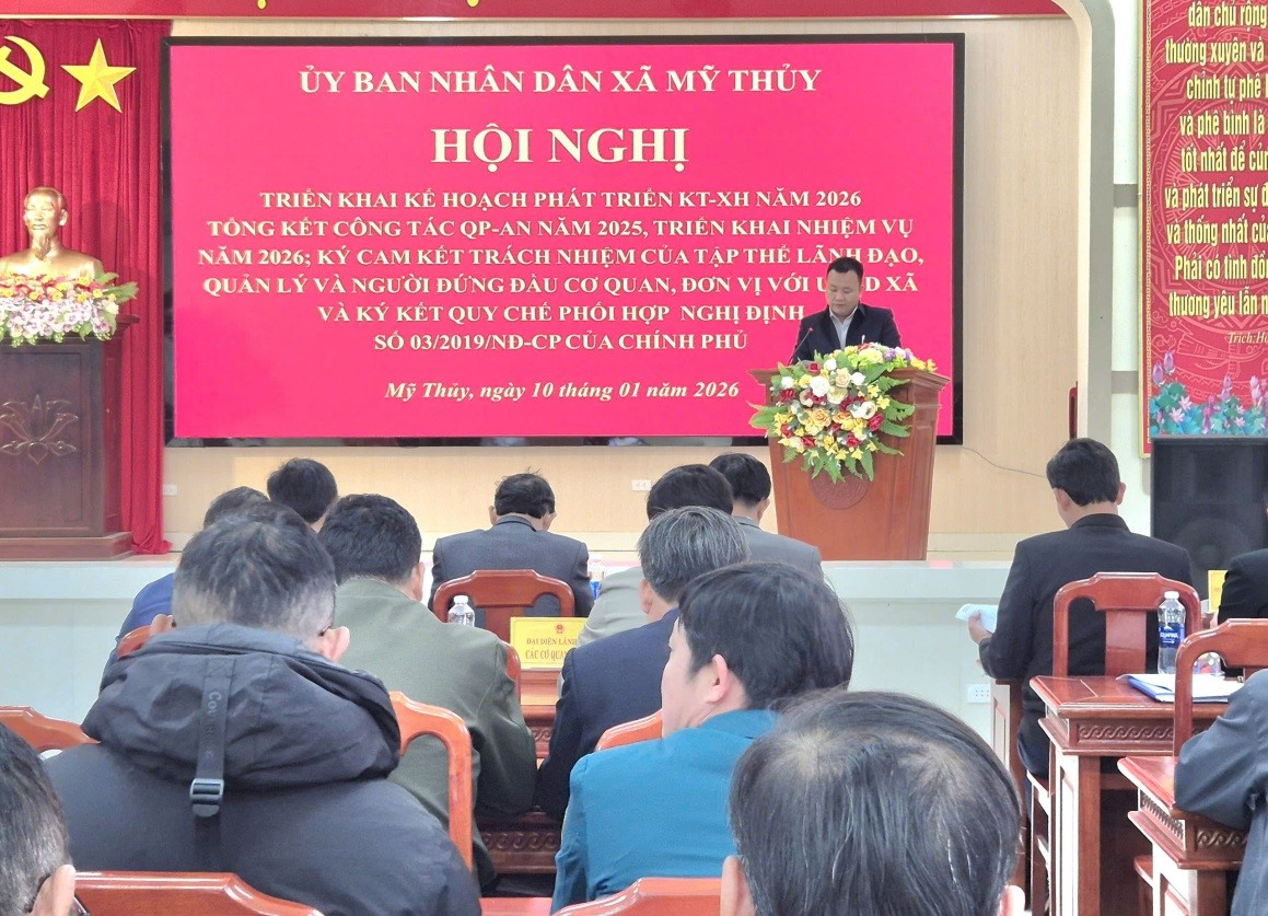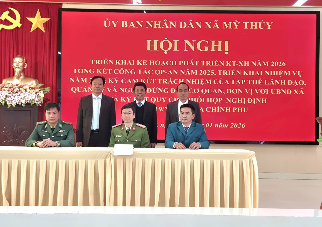 Sáng ngày 10/01/2026, UBND xã Mỹ Thủy tổ chức Hội nghị triển khai kế hoạch phát triển kinh tế - xã hội (KT-XH) năm 2026, tổng kết công tác quốc phòng an ninh (QP-AN) năm 2025, triển khai nhiệm vụ năm 2026; ký cam kết trách nhiệm của tập thể lãnh đạo, quản lý và người đứng đầu cơ quan, đơn vị với UBND xã và ký kết Quy chế phối hợp theo Nghị định số 03/2019/NĐ-CP của Chính phủ.