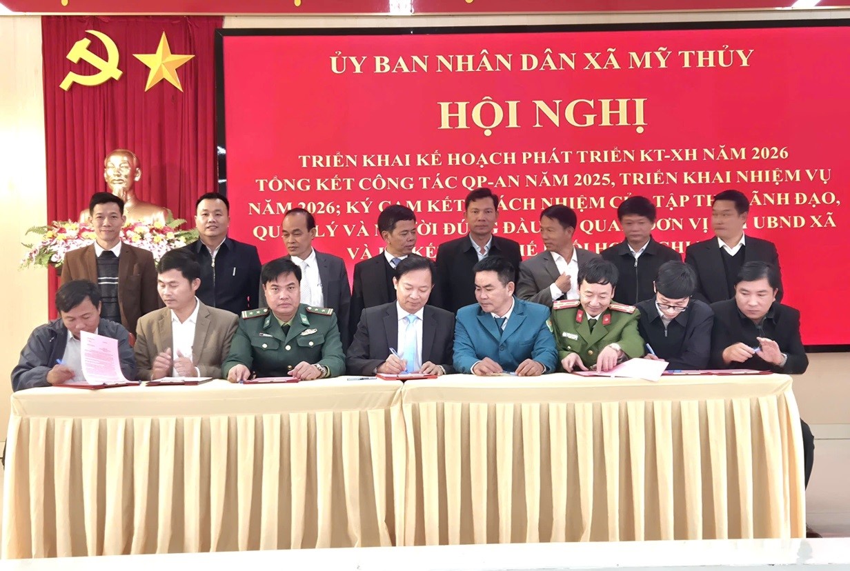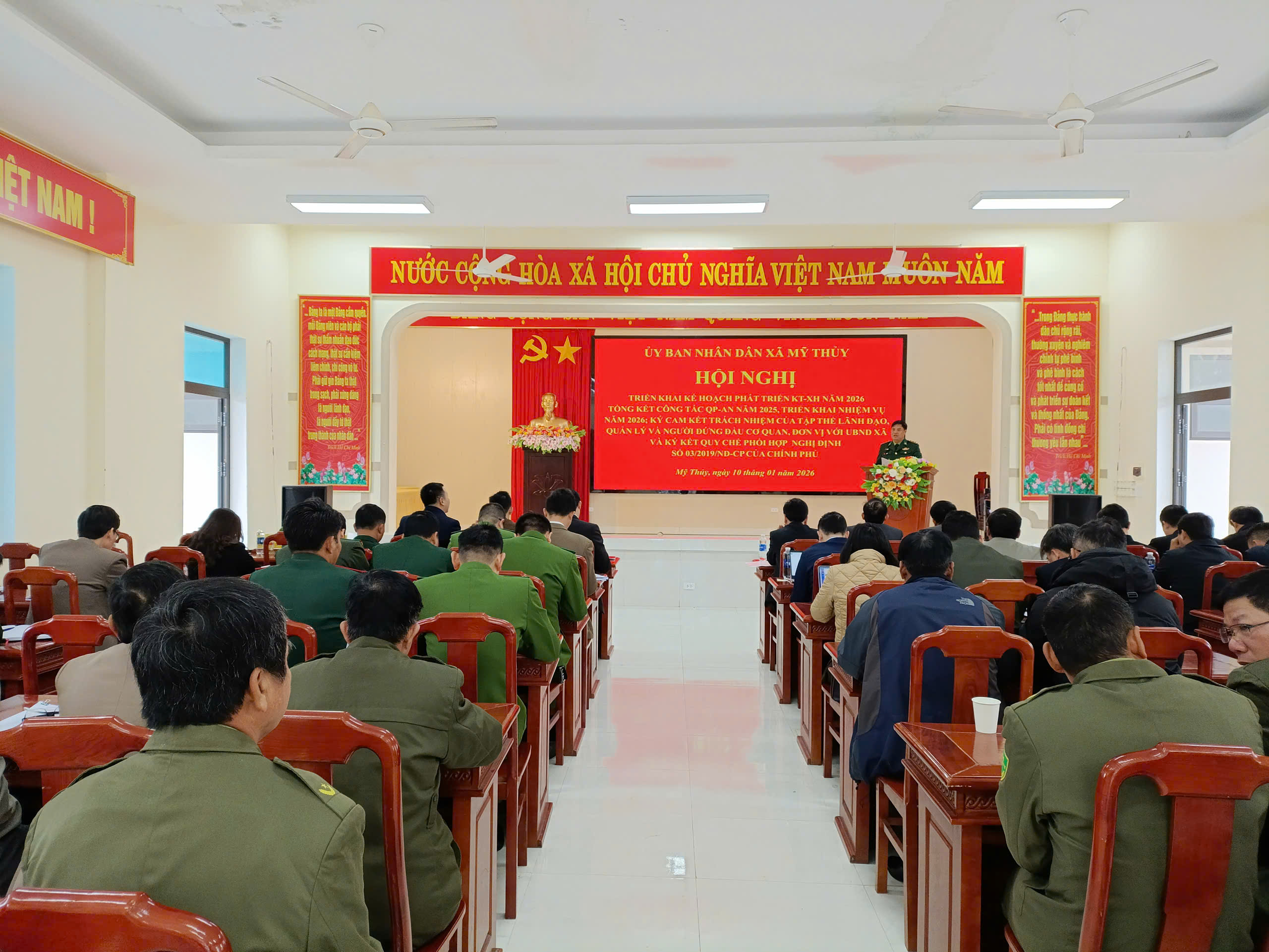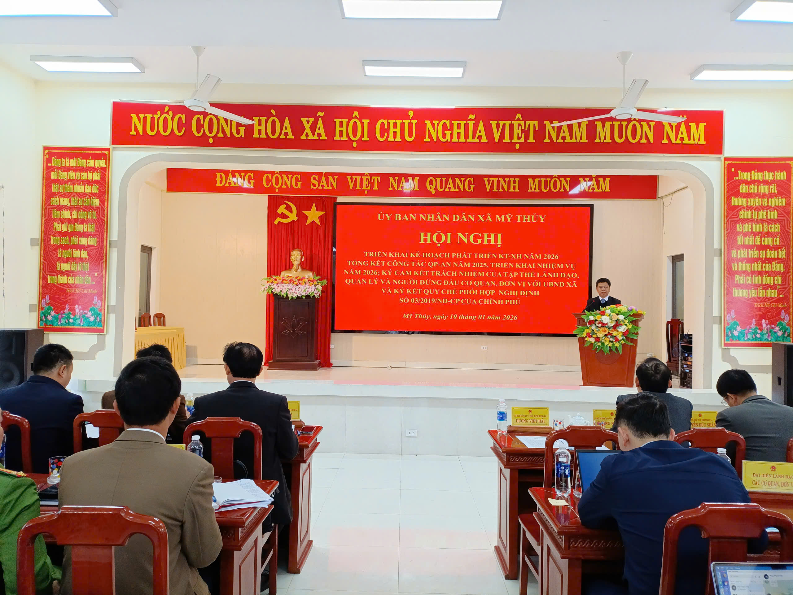 Sáng ngày 10/01/2026, UBND xã Mỹ Thủy tổ chức Hội nghị triển khai kế hoạch phát triển kinh tế - xã hội (KT-XH) năm 2026, tổng kết công tác quốc phòng an ninh (QP-AN) năm 2025, triển khai nhiệm vụ năm 2026; ký cam kết trách nhiệm của tập thể lãnh đạo, quản lý và người đứng đầu cơ quan, đơn vị với UBND xã và ký kết Quy chế phối hợp theo Nghị định số 03/2019/NĐ-CP của Chính phủ.